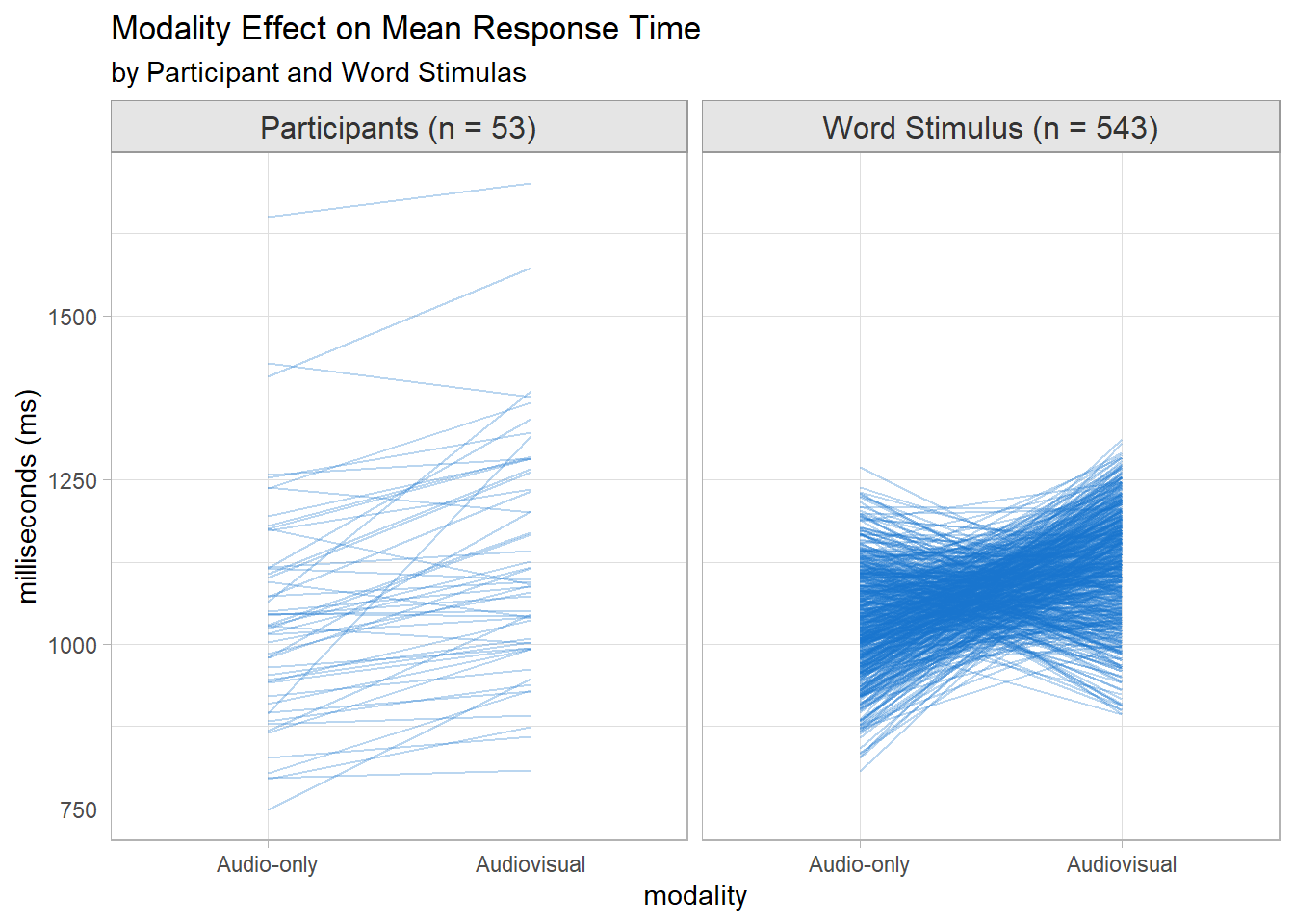 bind_rows(Participants =summarize(rt_dat, .by =c(modality, PID), M =mean(RT)),Stimulus =summarize(rt_dat, .by =c(modality, stim), M =mean(RT)),.id ="Factor") |>mutate(Factor =case_when( Factor =="Participants"~glue("Participants (n = {n_PID})"), Factor =="Stimulus"~glue("Word Stimulus (n = {n_stim})") ),grp =coalesce(PID, stim) ) %>%ggplot(aes(x = modality)) +geom_line(aes(y = M, group = grp), alpha = .3, color ="dodgerblue3") +facet_wrap(facets =vars(Factor)) +labs(title ="Modality Effect on Mean Response Time",subtitle ="by Participant and Word Stimulas",y ="milliseconds (ms)" )