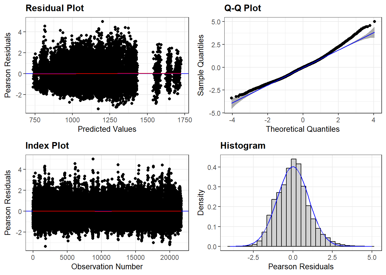 The linear regression model assumptions still apply: the relationship between the predictors and the response is linear and the residuals are independent random variables normally distributed with mean zero and constant variance. Additionally, the the random effects intercepts and slopes are assumed to follow a normal distribution. Use residual plots to assess linearity, homoscedasticity, and independence. Use Q-Q plots to check the normality of residuals and random effects. Variance inflation factors (VIFs) can help detect multicollinearity among predictors.